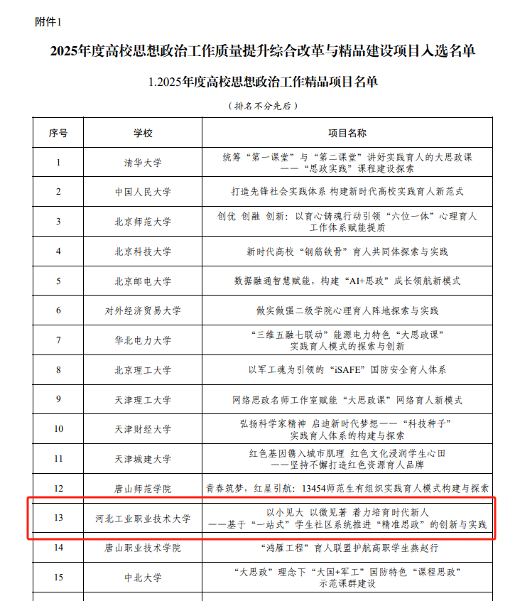 教育部2025年度高校思想政治工作质量提升综合改革与精品建设项目是深化教育综合改革,完善立德树人机制,着眼“时代新人铸魂工程”提质升级,着力建设高质量思想政治工作体系、构筑立德树人新格局的有力支撑。
