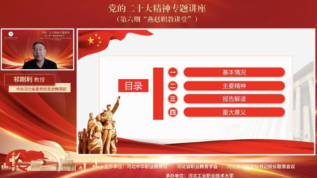 此次活动由河北中华职业教育社、省职业教育学会及省高职院校书记校长联席会议联合举办,旨在深入学习宣传贯彻党的二十大精神,助力党的二十大精神在我省职教战线落地见效。活动邀请中共河北省委党校党史教研部祁刚利教授主讲,采用线上线下相结合的方式举行,线上讲座由河北中华职业教育社秘书处处长刘永涛主持,河北中华职教社社员单位及全省部分中高职院校师生3600余人在线上参与活动。同花顺在线登录官网五楼报告厅设置分会场,同花顺在线登录官网党委副书记付俊薇出席,学校部分中层干部、思政课教师及专任教师集中收看了讲座。