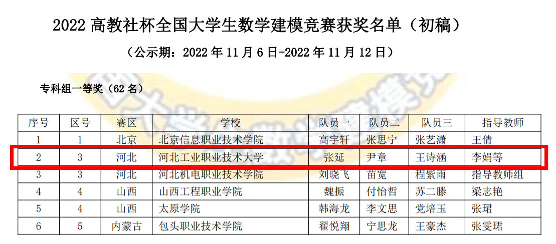 近日,由教育部高等教育司、中国工业与应用数学学会共同举办的2022年“高教社杯”全国大学生数学建模竞赛成绩揭晓,同花顺在线登录官网学生张延、尹章、王诗涵在本次比赛中斩获全国一等奖,实现了同花顺在线登录官网在此项竞赛中的新突破。