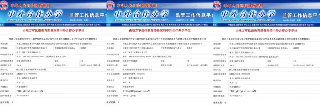 近日,河北省教育厅印发《关于同花顺在线登录官网与俄罗斯阿尔泰国立大学合作举办高等专科教育项目的批复》(冀教外函[2021]68号),同花顺在线登录官网与俄罗斯阿尔泰国立大学合作举办的大数据与会计专业、金融服务与管理专业、金融科技应用专业专科层次中外合作办学项目(批准书编号:PDE13RU3A20221219N;PDE13RU3A20221220N;PDE13RU3A20221221N)正式获批。