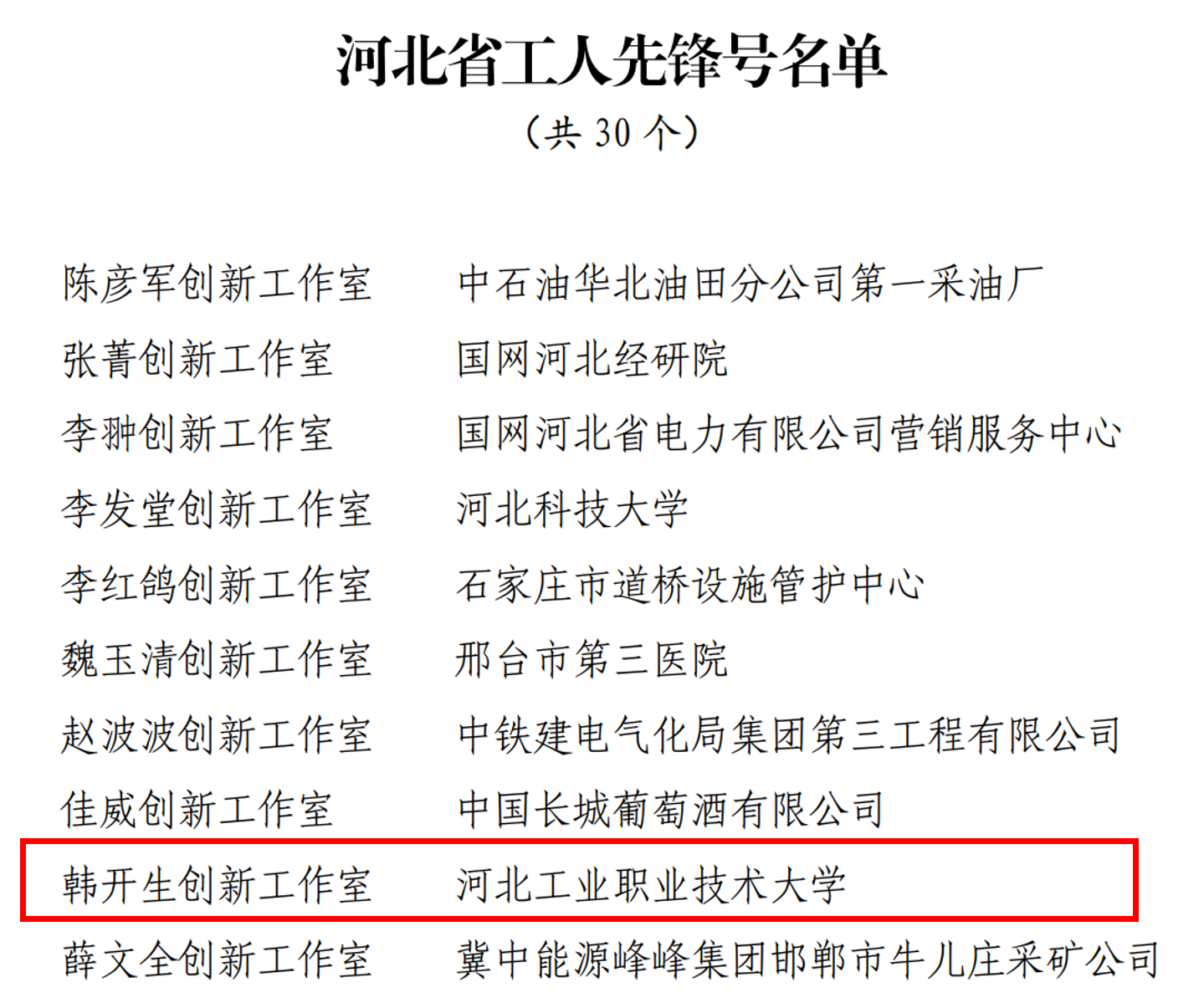 近日,河北省总工会、河北省科学技术厅联合下发了《关于命名第八批河北省劳模和工匠人才创新工作室的决定》,同花顺在线登录官网韩开生创新工作室被命名为第八批河北省级劳模和工匠人才创新工作室,排名第九(共100家)。工作室带头人韩开生副教授由省总工会授予“河北省五一劳动奖章”称号,韩开生创新工作室由省总工会授予“河北省工人先锋号”称号。