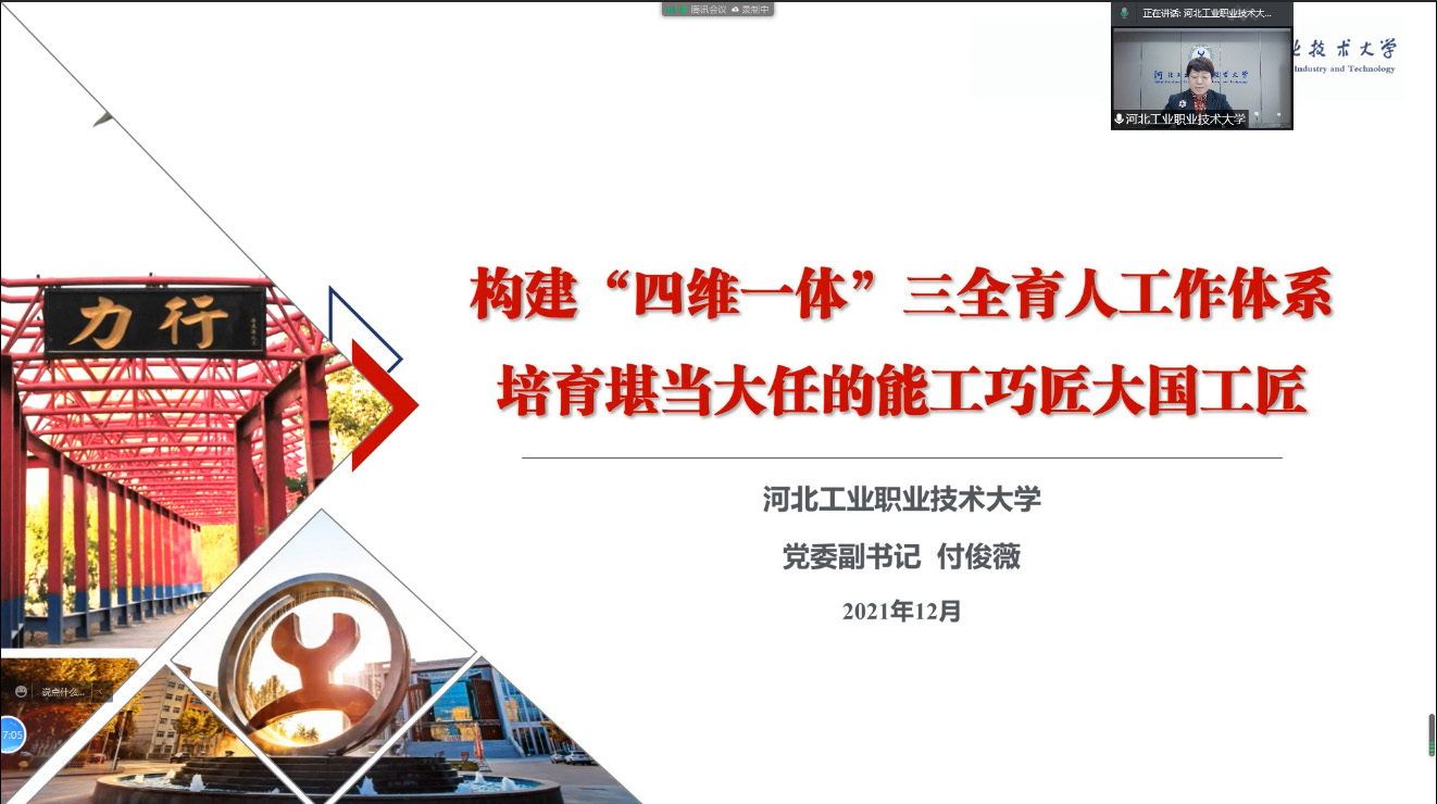 同花顺在线登录官网党委副书记付俊薇以“构建‘四维一体’三全育人工作体系,培育堪当大任的能工巧匠大国工匠”为题,从建设校企共同育人体、多元实施育人工程、建立全方位育人基地、构建全员评价考核体系四个方面发言交流。她指出学校认真贯彻落实习近平总书记对教育工作的重要指示,紧紧围绕立德树人根本任务,以育人队伍-育人工程-育人基地-育人评价为突破口,积极构建“四维一体”三全育人工作体系,全力推动了思想政治工作质量提升。