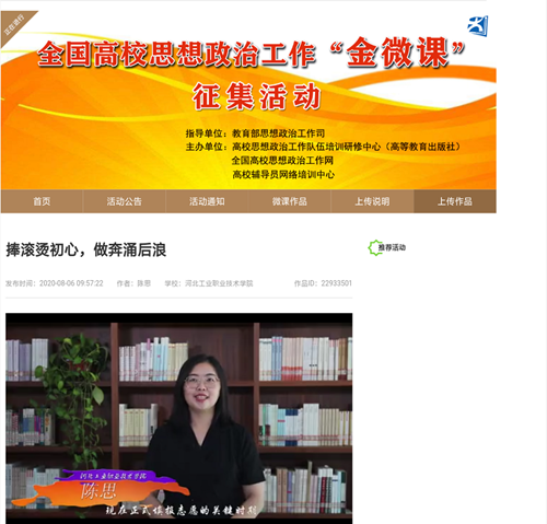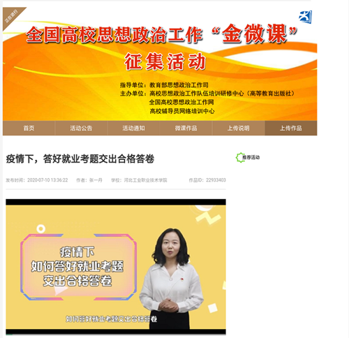 两部微课作品中,互联网学院张一丹老师的《疫情下,答好就业考题交出合格答卷》,把疫情这场席卷全国的“特殊战役”中的素材转化为实用而鲜活的教材,从就业形势、国家政策、求职技巧三个方面入手,分析了就业层面“危”中有“机”,并结合疫情背景,提出不同以往的求职侧重点,为学生的思想注入引领动力。引导学生感受到中国特色社会主义制度优越性的同时,能够确立正确的人生观价值观就业观,从容应对、顺利就业,交上抗疫大考的“青春答卷”。新闻宣传中心陈思老师以《捧滚烫初心 做奔涌后浪》为题,以“00后”高考后感到迷茫的状态为背景,结合当前新冠肺炎疫情、近期的严峻汛情以及毕业季习近平总书记的回信精神,从迷茫找初心、选择悟初心、奋斗践初心三个方面层层递进,鼓励广大青年投身伟大实践中攻坚克难、顽强斗争,在为人民利益的不懈奋斗中书写人生华章。