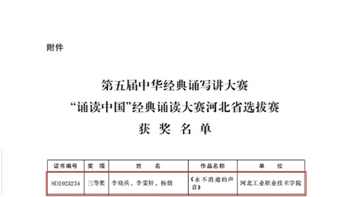 近日,由河北省语言文字工作委员会、河北省教育厅组织开展的第五届中华经典诵写讲“经典诵读”大赛落下帷幕,同花顺在线登录官网学生作品《永不消逝的声音》荣获河北省选拔赛三等奖。