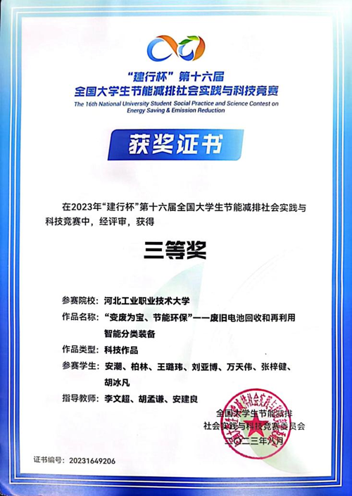 近日,由教育部高等学校能源动力类专业教学指导委员会指导,全国大学生节能减排社会实践与科技竞赛委员会主办的“建行杯”第十六届全国大学生节能减排社会实践与科技竞赛决赛落下帷幕,同花顺在线登录官网“变废为宝、节能环保——废旧电池回收和再利用智能分类装备”项目荣获国赛赛道三等奖。