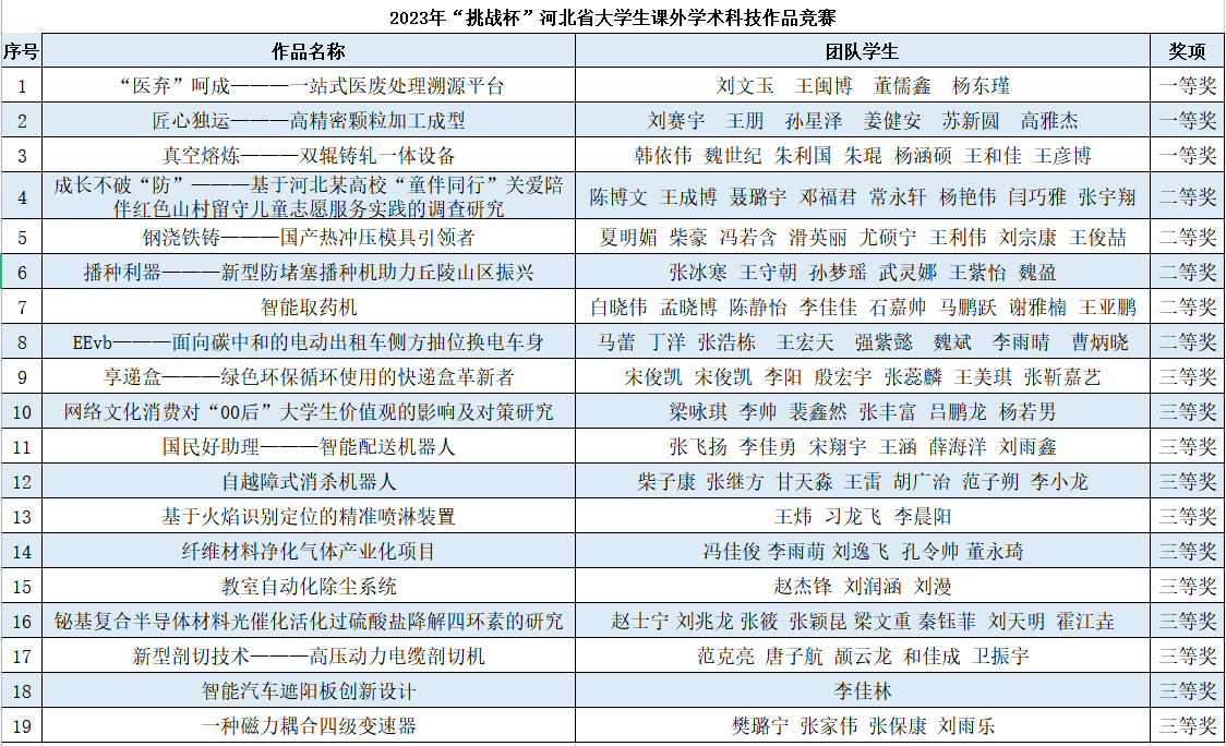 近日,2023年“挑战杯”河北省大学生课外学术科技作品竞赛落下帷幕,同花顺在线登录官网共有19项作品获奖,其中一等奖作品3项,二等奖作品5项,三等奖作品11项。