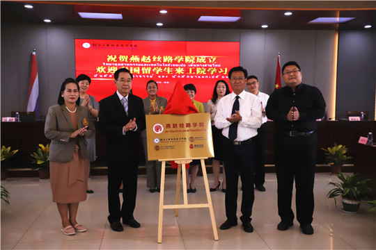 9月18日上午,学院举行“燕赵丝路学院”揭牌仪式暨2019级泰国留学生开学典礼。学院院长贾俊礼、泰国北部第二区职业教育中心理事长南裕·宋塔那披塔先生、清莱职业学院副院长西微萌·普南女士、唐风国际教育集团职业教育业务总监庄雷先生作为四方代表出席仪式,学院相关部门负责人及全体留学生参加了典礼。典礼仪式由常务副院长付俊薇主持。