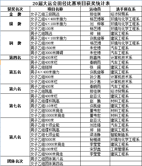 我院代表队夺得佳绩,与学院领导的关心和基础课教学部对田径队训练工作的高度重视是密不可分,比赛前,我院付俊微副院长深入训练现场给予了教练员和运动员极大的关怀和亲切的慰问。为了准备本次大运会,基础课教学部精心组织安排各项保障服务,全体教练员与运动员坚持长期训练,牺牲节假日和双休日,克服运动员伤病和场地器材不足等困难,科学训练,严格管理,狠抓队风建设,使运动员自身素质和运动成绩有了大幅度提高。田径队所有教练员和运动员为争取优异的运动成绩努力到了最后。佳绩的取得,也离不开在幕后默默奉献的后勤管理处、学院工会、培训中心、各系部的大力支持,在此,对各部门的大力支持和辛勤付出表示衷心地感谢!
