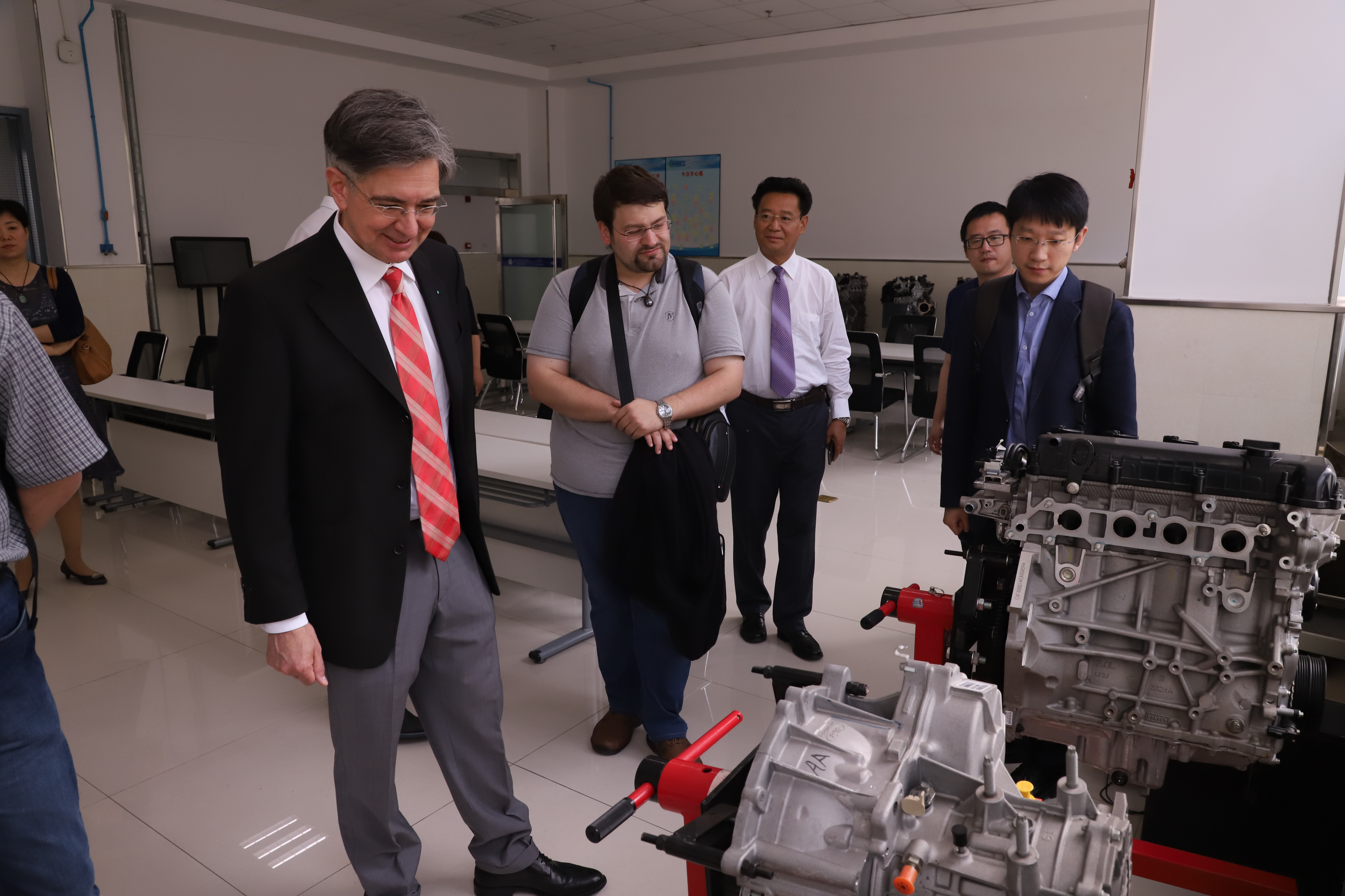 来宾在贾俊礼院长、付俊薇副院长的陪同下赴汽车工程系和智能制造学院参观校内实训基地,并感受了我国非物质文化遗产铁板浮雕的艺术魅力。随后代表团赴会议室进行会谈。参加本次会议的有国际教育交流中心、汽车工程系、智能制造学院等部门负责人以及河北化工医药职业技术学院专业老师。院领导先后向来宾介绍了我院的基本情况与中德合作现状,随后来宾一一介绍各自单位的情况,并表达了与我院的合作意向。双方就中德师资交流、课程与课程标准开发、企业培训师、企业实训课程等方面的合作交换了意见。