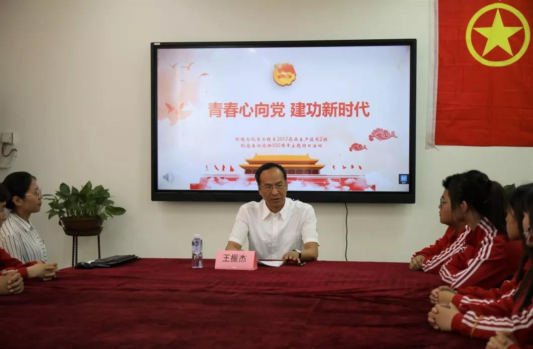 5月9日下午,党委书记王振杰来到环境与化学工程系2017级药品生产技术专业团支部举办的“青春心向党,建功新时代”主题团日活动的现场,和团员青年亲切交流,并对团员青年提出殷切希望。学工部及环境与化学工程系相关负责人也一同参与了主题团日。