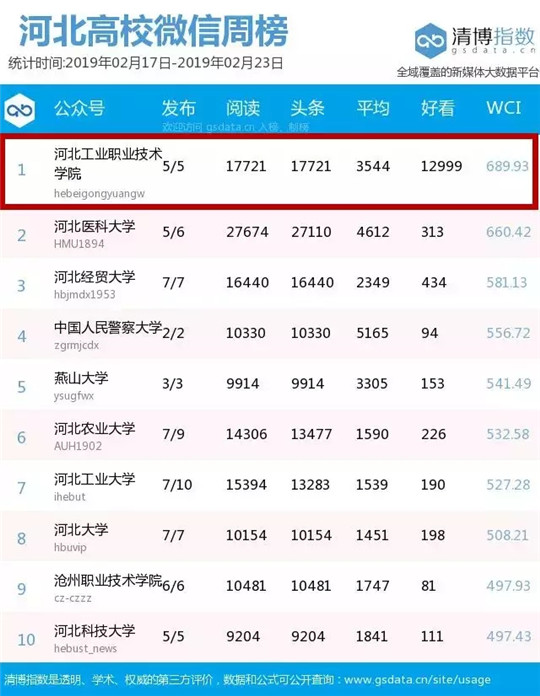 2月25日,在中国青年报发布的最新一期(2月17日—23日)全国职业院校微信公众号综合影响力排行榜中,我院官方微信公众号以高达689.93的WCI综合影响力指数登顶榜首,这也是学院官微自开通以来首次登顶全国职业院校微信公众号综合影响力排行榜。学院官微同期位居“河北发布”公布的河北省高校微信榜单周榜第一名。