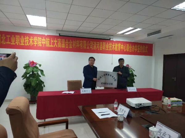 2018年,经中航上大高温合金材料有限公司、清河县政府、清河县职教中心与我院的通力合作,中航上大8名一线专业技术骨干通过单独招生考试考取了我院材料工程系。本次校企联合培养、联合办学签约仪式的举办,标志着8名企业在岗职工的学徒制培养正式启动。