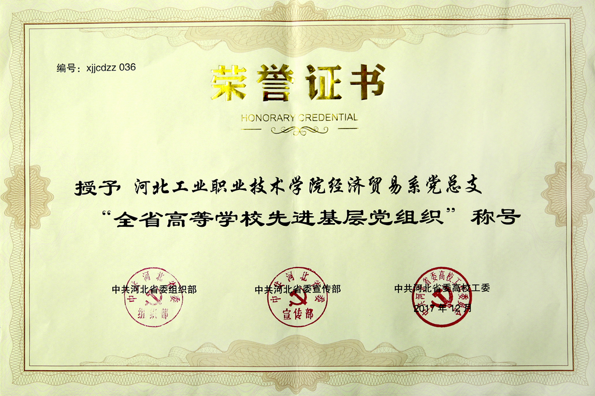 近期,省委组织部、省委宣传部和省委高校工委发布了《关于表彰全省高等学校党的建设工作先进集体、先进基层党组织、优秀共产党员和优秀党务工作者的决定》(冀高校工委[2017]10号),我院经济贸易系党总支被授予“全省高等学校先进基层党组织”荣誉称号。