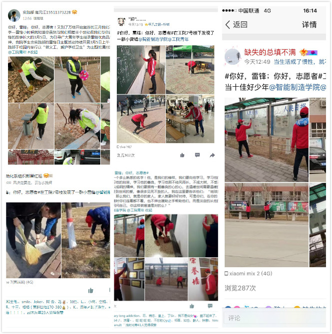 此次“靓丽校园”活动的清洁区域包括学生公寓周边地区、行政楼、教学楼周边地区、教室、宣传栏、操场以及校园卫生死角。虽然清洁任务很重,但是大家都以饱满的热情和积极的态度投入到了志愿工作中。教学楼前、垃圾桶旁、宣传栏前、走廊内、车棚中、校门口……到处都是志愿者们努力的身影。经过志愿者们的辛苦劳动,宣传栏前由广告满墙变得干净整洁,教室里变得整洁明亮,操场上变得绿意盎然,校门口的共享单车摆放整齐有序,整体校园环境焕然一新。此外,“工院青年”QQ校园空间还开通了“你好,雷锋;你好,志愿者”线上话题互动,“靓丽校园”活动得到了工院学子的广泛关注和积极参与,引发了网络转发热潮,形成了线上线下的有效联动。