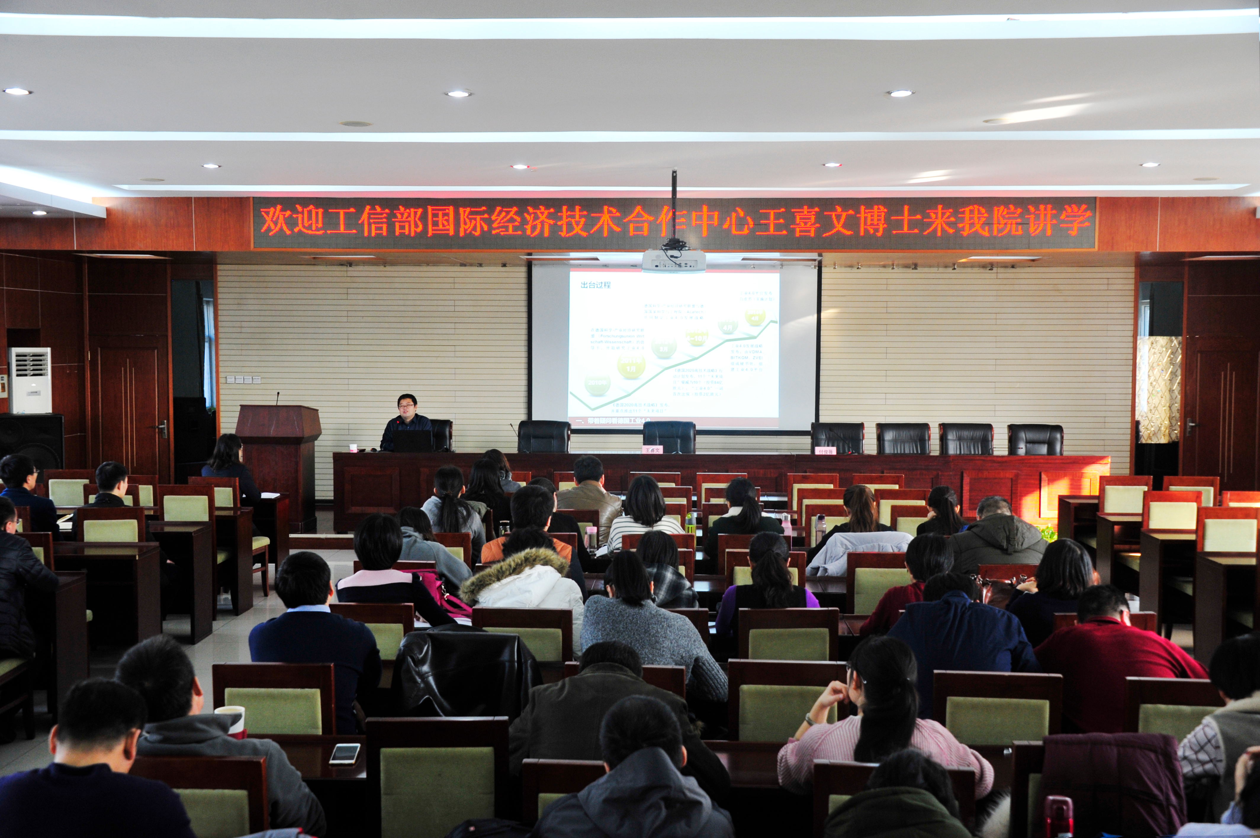 12月12日下午,工信部国际经济技术合作中心电子商务研究所所长王喜文博士受邀莅临我院,在五楼报告厅为我院教师带来一场“工业4.0和中国制造2025”的专题讲座。各系部主任、副主任、教学秘书、专业教师代表、科研处全体人员及创新创业指导教师200多人聆听讲座。学院常务副院长付俊薇教授出席并致欢迎词。