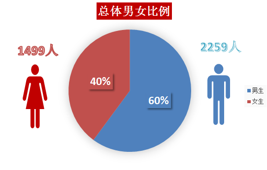 参与纳新的新生中,男生人数较多,共2259人,占纳新人数的60%,女生1499人,占纳新人数的40%。