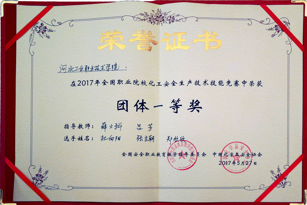 由全国安全职业教育教学指导委员会、中国化学品安全协会主办,化工安全专业分委员会承办,华北科技学院实训基地协办的2017年全国职业院校化工安全生产技术技能竞赛于2017年5月25日—27日在秦皇岛博赫科技园隆重举行。