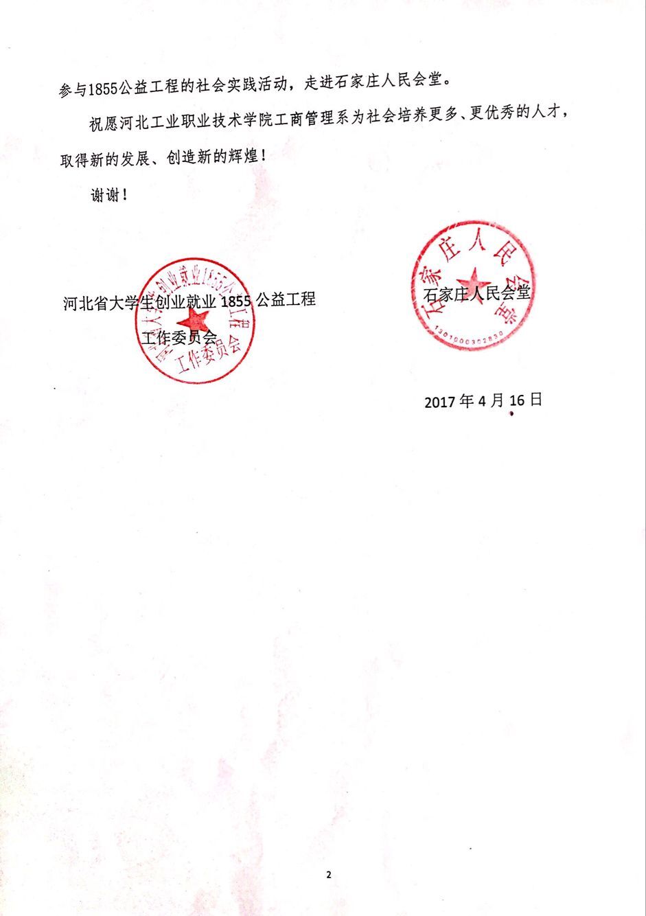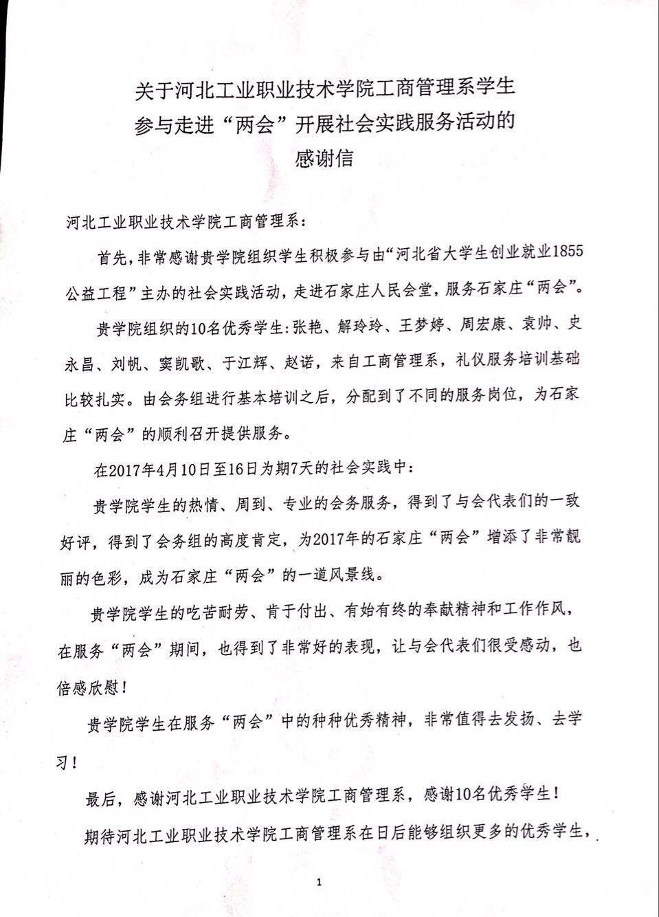 表彰大会上,丁江涛秘书长和闫小平主任分别为服务“两会”的同学颁发了荣誉证书。闫小平宣读了感谢信。丁江涛高度评价了10位志愿者,他说,我院志愿者在不同的服务岗位上,表现出了吃苦耐劳,热情专业,肯与付出,有始有终的奉献精神和工作作风,值得去推广和学习,为石家庄“两会”增添了非常靓丽的色彩,成为了石家庄“两会”的一道风景线。并对我院培养出了这么优秀的学生表示感谢!希望日后能够有更多的优秀学子参与到社会实践活动中。随后志愿者代表15级航空服务班张燕同学代表学生进行了发言。会后,工商管理系相关领导与1855公益工程负责人对继续加强合作达成了共识。