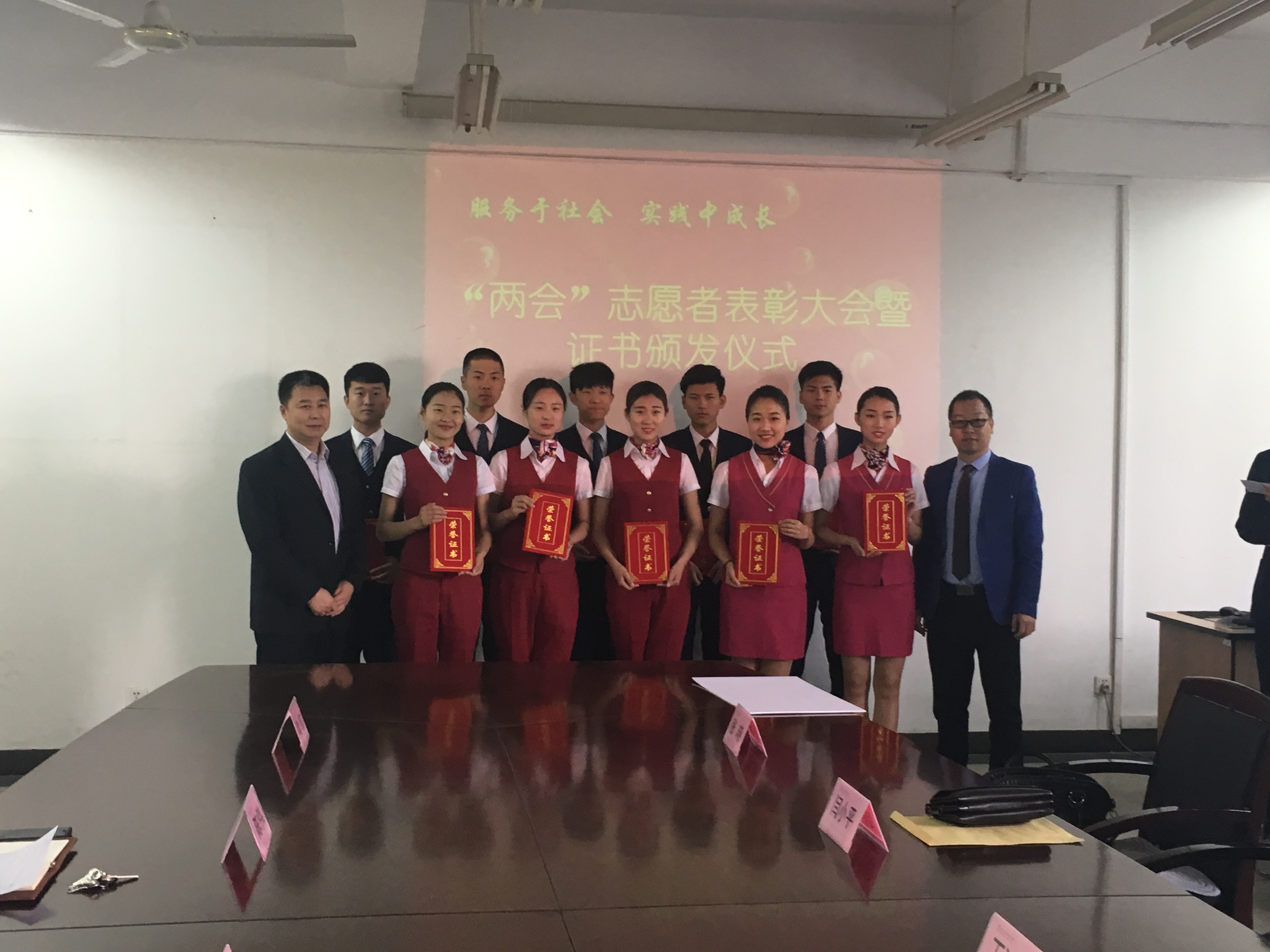 4月25日上午,服务石家庄“两会”志愿者表彰大会在我院2号楼309召开。 1855公益工程秘书长丁江涛和石家庄人民会堂办公室主任闫小平一行4人来到我院,为服务石家庄“两会”的我院空乘专业学生颁发证书,参加本次表彰会的还有东方领航教育集团负责人及工商管理系相关负责人。