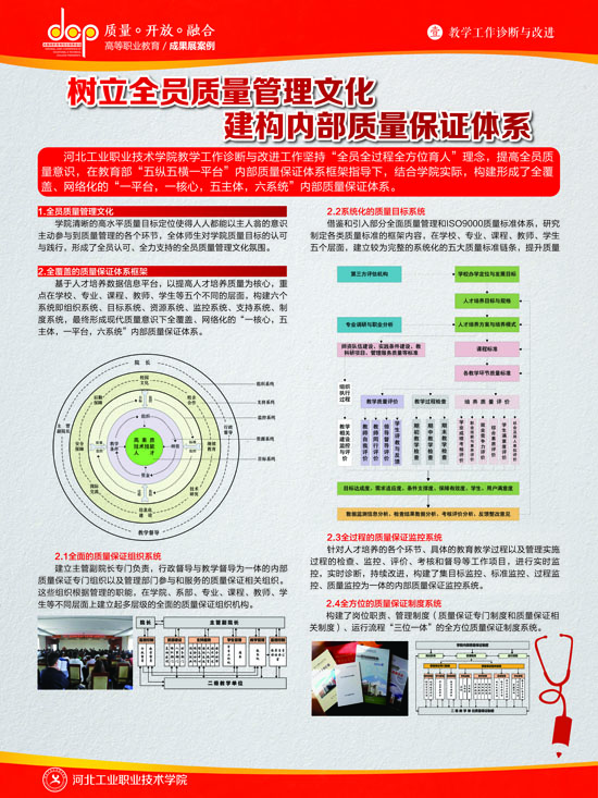 在刚刚结束的全国高职高专校长联席会议2016年年会上,我院“树立全员质量管理文化 构建内部质量保证体系”典型案例被评为优秀案例。获此殊荣,既是对我院内部质量保证体系建设工作的充分肯定,也是下一步推进我院内涵建设的动力。