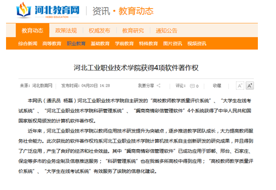 近日,我院自主研发的“高校教师教学质量评价系统”、“大学生在线考试系统”、“河北工业职业技术学院科研管理系统”、“冀商商情彩信管理软件”4个系统获得了中华人民共和国国家版权局颁发的计算机软件著作权,受到河北教育网密切关注。