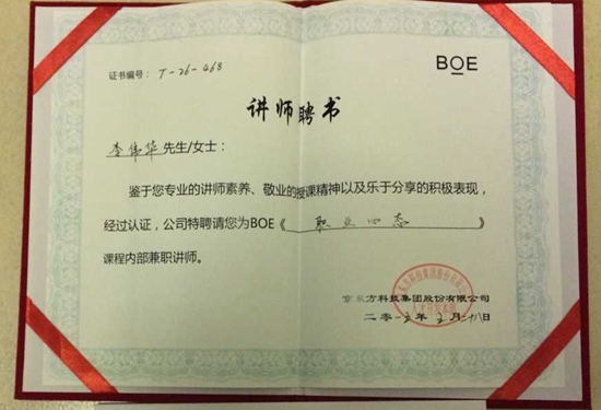 会上,参会人员就校企合作新趋势新模式、高水平技能人才培养与使用以及职业教育的改革方向与企业用人结构如何应对等进行了充分而热烈的讨论,对京东方特色课程及企业培训体系进行了讲解和认证。学院信息工程与自动化系老师李伟华获得《职业心态》专业课程京东方内部企业教师认证。会议还进行了学生参赛作品颁奖,我院订单班学生吕国鑫 、王亚阔等五名学生提交的参赛作品《我们的京东方》视频,获得优秀奖。