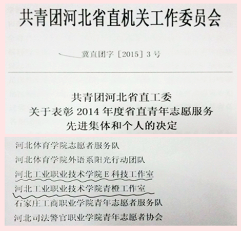 近日,共青团河北省直工委组织开展省直青年志愿服务先进集体评选,旨在表彰2014年度在河北省内从事志愿服务、奉献社会、受群众欢迎和社会认可的优秀志愿服务集体和先进个人,共评选出省直青年志愿服务先进集体40个。我院青橙工作室、E科技工作室凭借创新的社团理念、浓厚的专业特色、丰富多彩且时效性强的实践志愿服务活动在众多竞争者中脱颖而出,被评为“2014年度河北省直优秀青年志愿服务集体”。