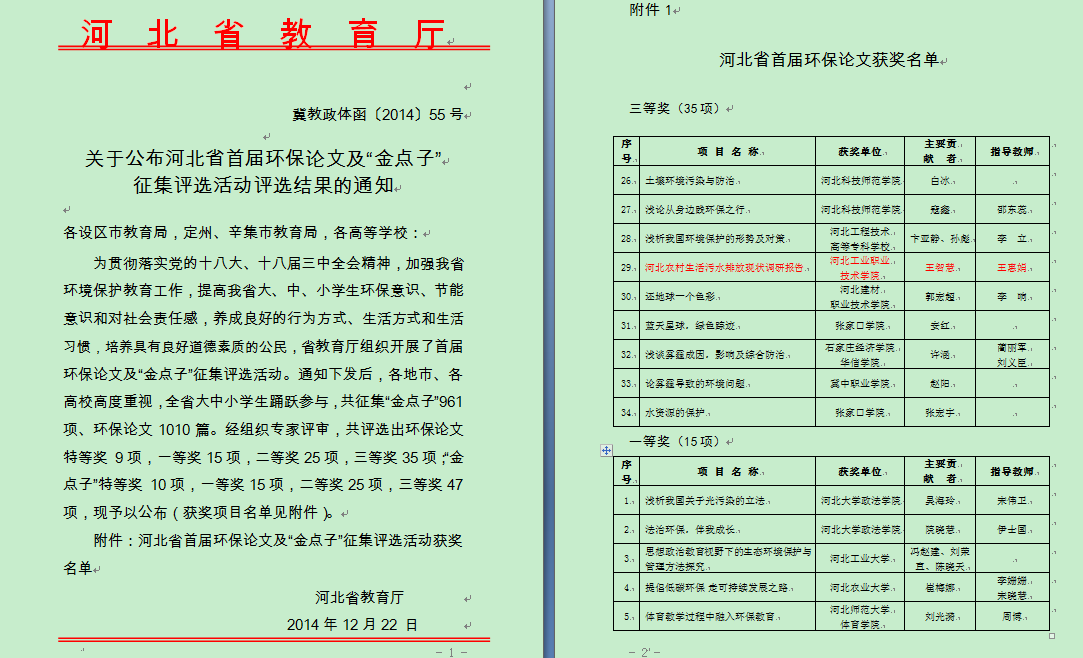 为贯彻落实党的十八大、十八届三中全会精神,加强全省环保教育工作,由省教育厅组织开展了首届环保论文及“金点子”征集评选活动。此次活动在全省本专科院校中共征集了环保论文1010篇,经过专家评审、优中选优,共评选出获奖论文84篇,其中由我院绿色之友协会王智慧同学撰写、王惠娟老师指导的论文《河北农村生活污水排放现状调研》喜获三等奖。