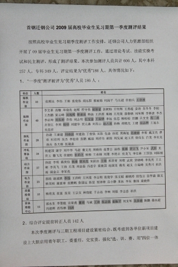 按公司有关规定:结合见习期第一季度测评结果,对见习期表现突出,学习能力强,职工认可度高,综合素质优秀,具备独立顶岗的毕业生予以提前转正。经首钢迁钢公司基层评议,在见习期第一季度测评“优秀”的186名毕业生中,共有142名毕业生(本科66人;专科76人)可以提前转正,在我院被评定为“优秀”的27名毕业生中共有15人达到了提前转正的资格。