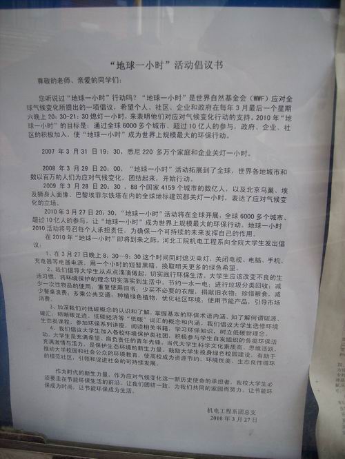 “地球一小时”是世界自然基金会(WWF)应对全球气候变化所提出的一项倡议,希望个人、社区、企业和政府在每年3月最后一个星期六20:30-21:30熄灯一小时,来表明他们对应对气候变化行动的支持。2010年“地球一小时”活动的主题是“熄灭灯火,点燃绿色”;目标是:通过全球6000多个城市、超过10亿人的参与,政府、企业、社区的积极加入,使“地球一小时”成为世界上规模最大的环保行动。