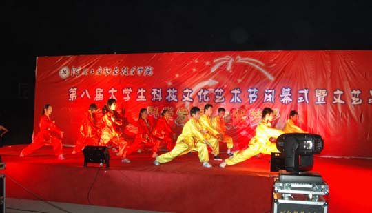 之后,文艺汇报演出在舞蹈《春之序曲》中拉开序幕,我院学子争相献技,演出内容精彩纷呈。歌曲《海阔天空》表达了工院学子在困难面前永不认输,笑对人生的雄心;舞蹈《烟雨斗笠》让人仿佛置身于傣乡山水中,感受傣族姑娘的青春气息;话剧《心声》是当代大学生内心的真实写照;舞蹈《拉花花儿》刚柔并济,反映了北方秧歌粗犷与含蓄的独特结合,是我院学生社团对非物质文化遗产的传承与发展;武术表演刚劲有力,让我们领略了中华武术的独特魅力;大学生形象展示则将当代大学生的青春与激情挥洒的淋漓尽致,一个个节目展现了我院学子的多才多艺,赢得台下观众阵阵掌声。最后,在大合唱《歌唱祖国》的嘹亮歌声中,第八届大学生科技文化艺术节圆满落幕。