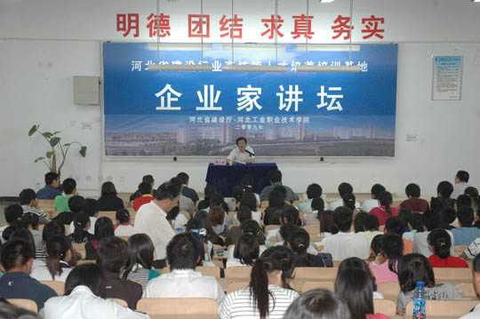“企业家讲坛”是河北省建设行业高技能人才培养培训基地一届一次会议的成果,将定期聘请建设行业著名企业总经理、人力资源部长、技术专家等就学生关注的热点问题到我院进行专题讲座,从而实现校企资源共享,共同发展、共同育人的模式,使河北省建设行业高技能人才培养培训基地更好的服务地方经济,服务行业企业。