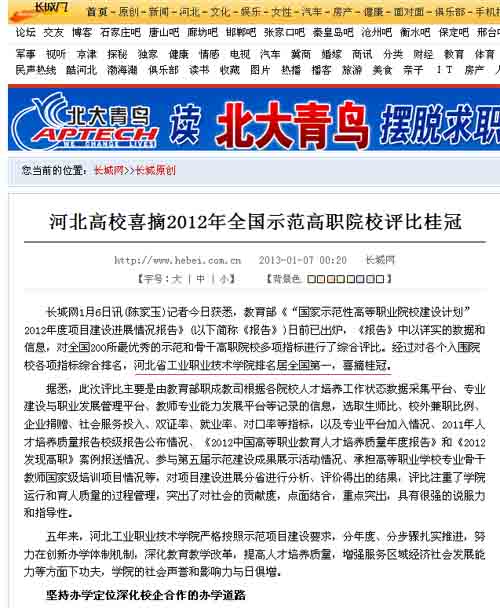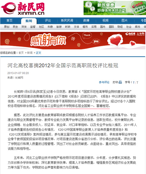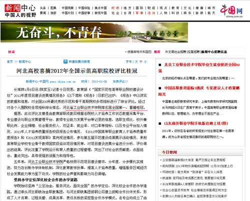日前,《长城网》对我院荣获“国家示范性高等职业院校建设计划”2012年度项目建设综合评比全国第一名进行专题报道,《人民网》、《新民网》、《中国日报国际频道》、《中国网》、《华禹教育》等多家媒体予以转载报道。