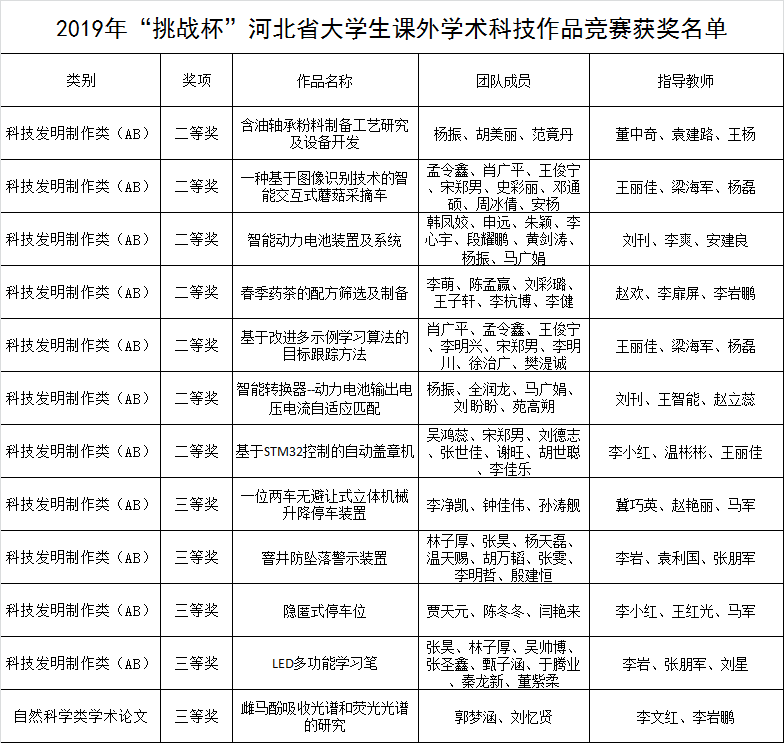 近日,由共青团河北省委、省教育厅、省科协、省社科院、省学联联合举办的2019年“挑战杯”河北省大学生课外学术科技作品竞赛落下帷幕,我院共有7项作品荣获二等奖、5项作品荣获三等奖。