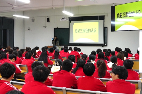 在本次讲座中,王老师从“三原色的认识”和“色彩的构成”两个方面带领同学们进入色彩艺术的殿堂。首先,王老师从色彩三原色入手,展示色彩的叠加,生动形象的解释了色彩艺术的运用,激发了同学们对色彩艺术的兴趣。接着为进一步让同学们体会色彩的魅力,王老师又介绍了视觉混合概念,提出“太阳照射后的视角变化”,来引发同学们的共鸣。引用印象派的彩油画画风和PS软件的工作原理,来解释三原色的混合,然后,王老师通过视频介绍色彩反射入对人脑的颜色感知,通过对波长吸收和反射的分析,来解释视觉混合的原理,运用色相环来拓展类似色、中差色、对比色等概念,拓宽了同学们的艺术视野。最后王老师向同学们介绍了用色彩间深浅层次的对比引出明度的概念,引用生活中装修风格学以致用,对比教室与电影院墙体颜色的不同,来解释色彩艺术在生活中的重要性。