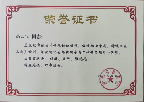 我院报送的《筑牢思政基石 赓续红色基因—构建多层次立体式思政工作平台》案例荣获河北省高校校园文化建设优秀成果三等奖;《旗帜锻造:高校党建育人与思政工作深度融合机制探索——“党员先进性熔铸 孵化打卡计划”》案例荣获河北省高校思想政治创新案例三等奖;《大学生能力提升工程——“淬火计划”》案例荣获河北省高校辅导员工作精品项目二等奖;《传承钢铁精神,锻造职业素质,铸就工匠品质》案例荣获河北省高校辅导员工作精品项目三等奖。