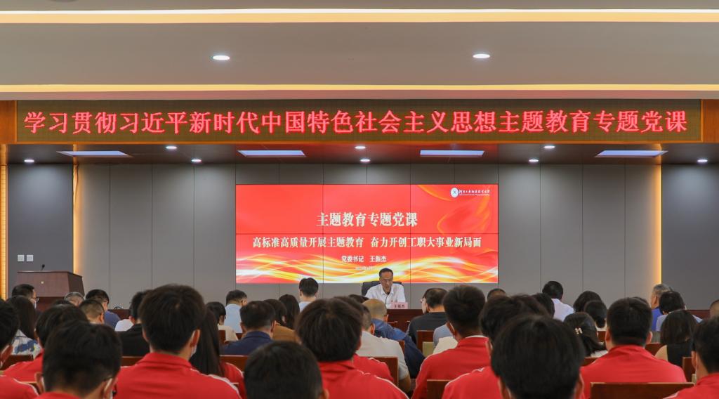 为推动学习贯彻习近平新时代中国特色社会主义思想主题教育走深走实、见行见效,按照学校主题教育工作安排,学校党委书记王振杰以“高标准高质量开展主题教育,奋力开创工职大事业新局面”为题,为学校中层以上干部、师生党支部书记、组织员和学生代表上了一堂深刻而生动的主题教育专题党课。省委主题教育第十八指导组关增利同志到会指导。