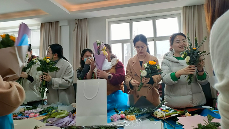 在红旗校区办公楼五楼,“花语轻吟”创意花束活动现场花香萦绕。女教职员工们充分发挥创意,将各种花卉与装饰元素巧妙搭配,创作出独具匠心的花束。