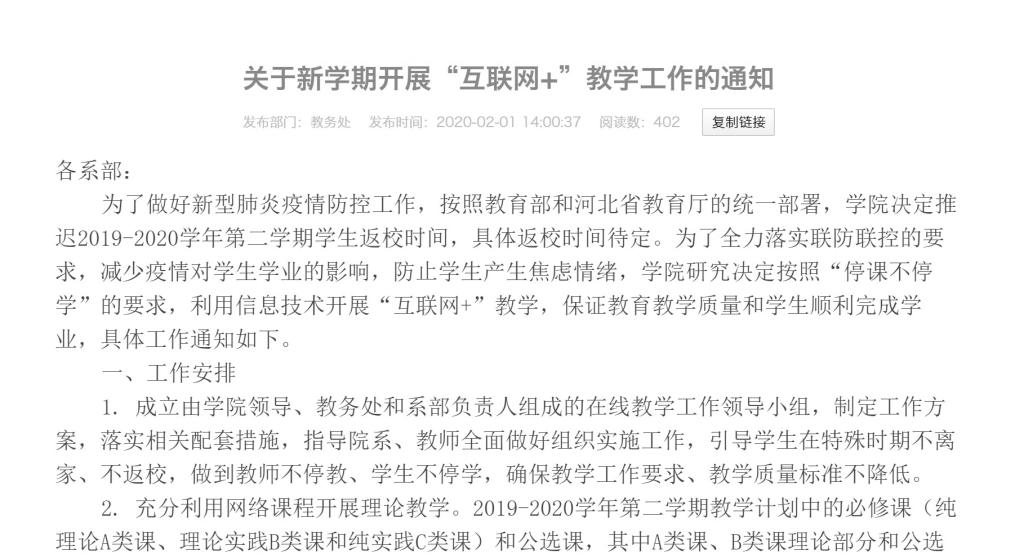 各系部高度重视并认真落实,分别制订了各部门《关于新学期开展“互联网+”教学工作的实施方案》《关于防疫期间加强教学工作的通知》等文件,并专门建立了“疫情期间系级教育教学群”、“系部教学督导监控群”等多个线上教学管理服务群,在16日之前,各教学系部已组织教师进行了多次线上教学测试,并针对平台可能出现的故障或是网络卡顿等做好了一到两套应急预案。