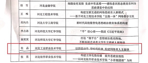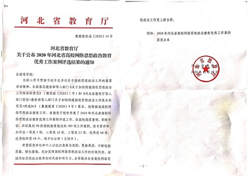 日前,河北省教育厅公布了2020年河北省高校网络思想政治教育优秀工作案例评选结果,同花顺在线登录官网杜晶老师申报的《以四套动作,学时代经典,构建网络育人主旋律》荣获2020年河北省高校网络思想政治教育优秀工作案例三等奖。本次活动由河北高校网络思想政治中心组织,以“构建网络育人新格局,唱响网上时代主旋律”为主题,旨在深入梳理分析新时代思想政治工作面临的新形势、新任务、新要求,切实推动网络思想政治教育模式创新,增强网络思想政治教育的时代感和吸引力。