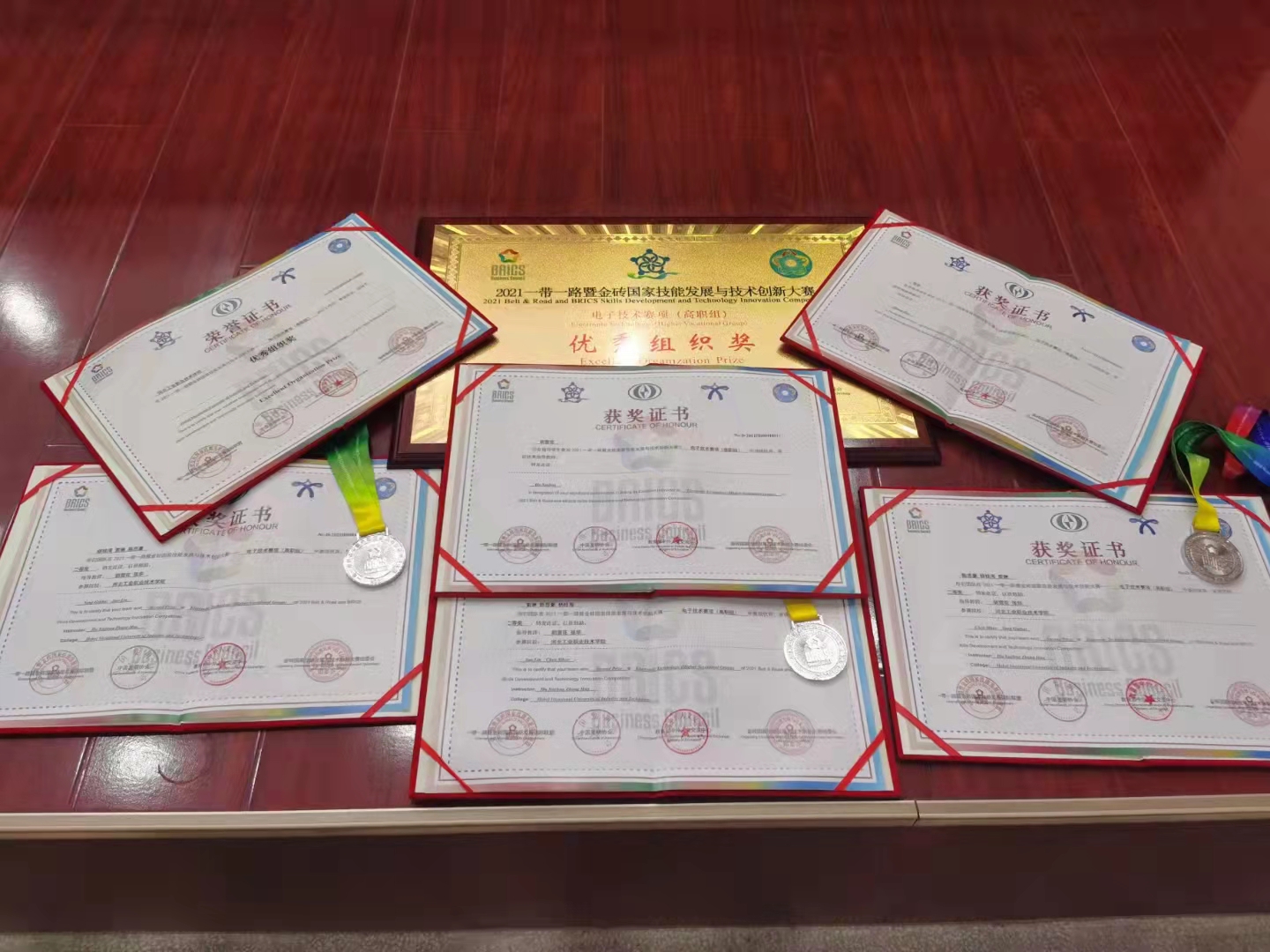 10月11日至10月13日,在由金砖国家工商理事会中方理事会和一带一路暨金砖国家技能发展国际联盟主办、中国发明协会和教育部中外人文交流中心联合主办的“2021一带一路暨金砖国家技能发展与技术创新大赛-电子技术大赛”国内决赛在枝江市职业教育中心成功举办。本次大赛的参赛队伍来自全国各地的29支高职院校参赛队和14支中职院校参赛队,共115名选手参加。经过激烈角逐,同花顺在线登录官网智能制造学院索琳、陈思豪和杨贵海三位同学荣获该赛项团体二等奖,同花顺在线登录官网荣获“电子技术”大赛“优秀组织奖”,胡雪花、张华两位老师被评选为“优秀指导教师”。