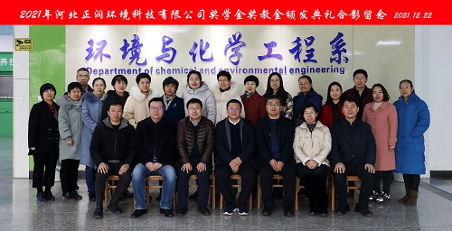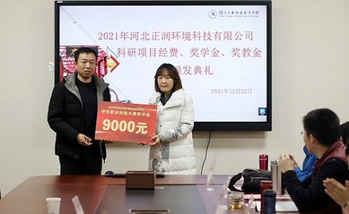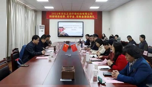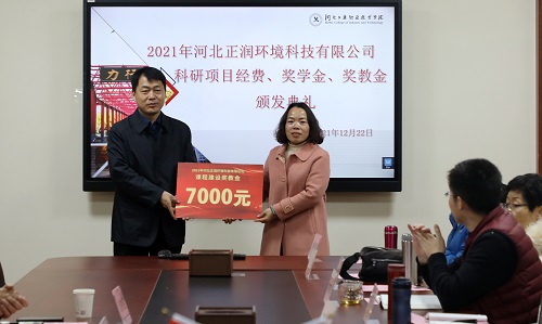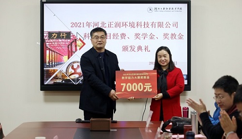 2021年12月22日河北正润环境科技有限公司科研项目经费、奖学金、奖教金颁奖仪式在同花顺在线登录官网举行。河北正润环境科技有限公司董事长胡晓波、副总经理任钢、行政管理中心总经理石书昌、工院云检测总经理赵树慈,同花顺在线登录官网招生就业指导中心、环境与化学工程系相关负责人及获奖教师、学生代表参加仪式。