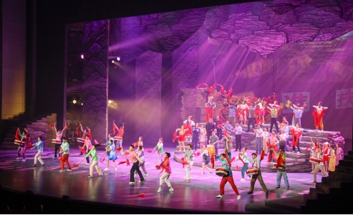 音乐剧《太行赞歌》叙事灵动,舞台呈现大气恢弘,以载歌载舞的艺术形式、融合河北民间音乐元素的旋律,艺术化地再现了阜平人民在党的领导下攻坚克难的动人形象。全剧运用“日记体”结构,通过讲述、戏剧表演、舞蹈音乐将阜平从脱贫攻坚到乡村振兴的过程艺术化地展现在观众面前。剧中运用了大量河北音乐元素尤其是阜平民间音乐元素,将民歌、吹歌、霸王鞭乐舞进行改编吸纳,地域特色鲜明。