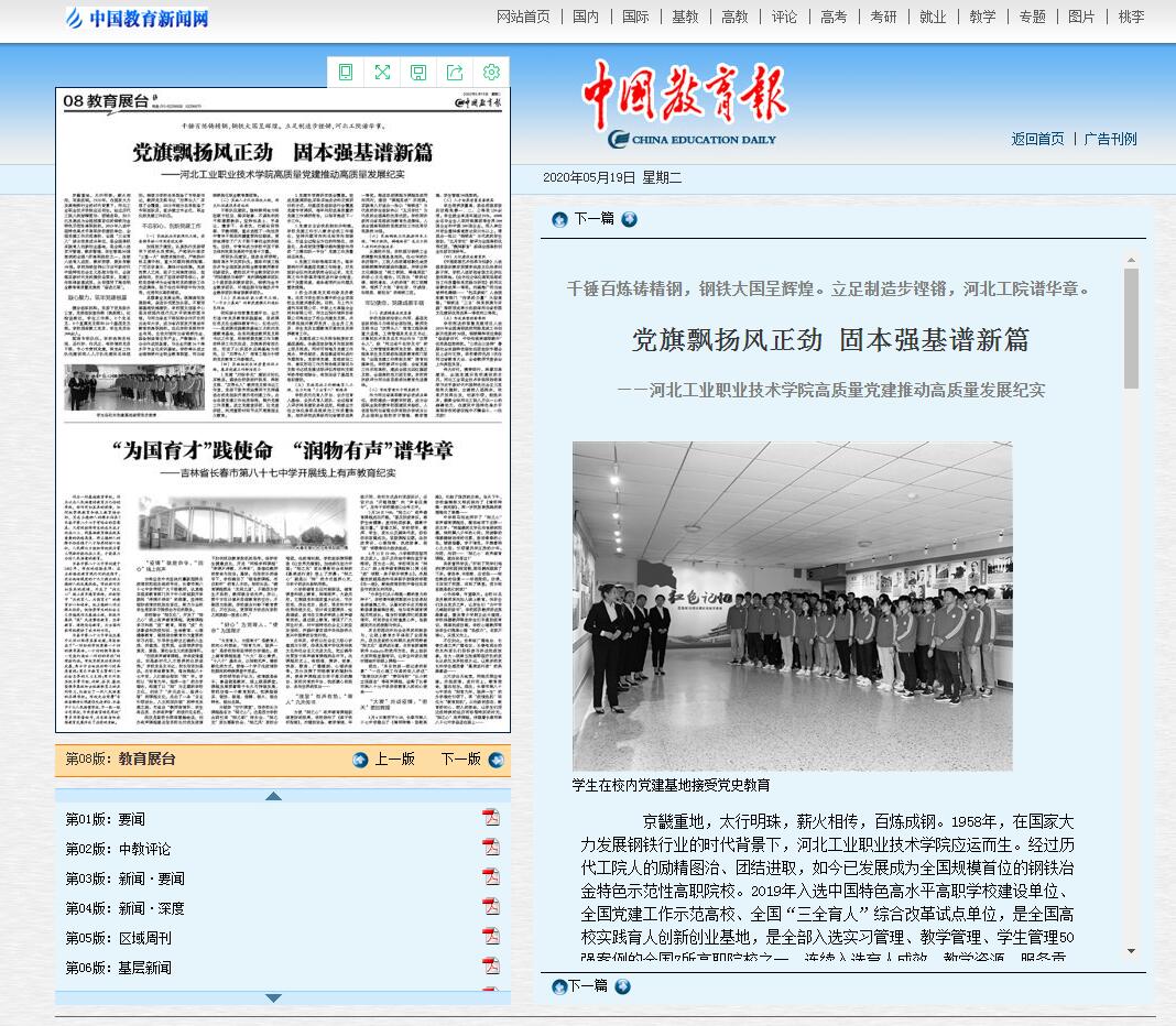 近日,《中国教育报》以《党旗飘扬风正劲,固本强基谱新篇——河北工业职业技术学院高质量党建推动高质量发展纪实》为题对我院党建工作进行了深度关注与报道。