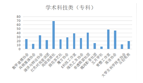 学术科技类专科纳新人数470人,占学术科技类社团纳新人数的65%。排名前三最受专科生欢迎的学术类社团是尚甜烘焙社、青橙工作室、英语协会。