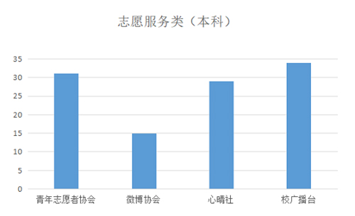 志愿服务类社团本科纳新人数109人,占志愿服务类社团纳新人数的40%,排名前三最受本科生欢迎的志愿服务类社团是校广播台、青年志愿者协会、心晴社。