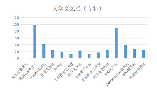 文学文艺类社团专科生纳新人数461人,占文学文艺类社团纳新人数的73%。排名前三最受专科生欢迎的文学文艺类社团是SPO礼仪社、Momentcrew街舞社、Always动漫社。