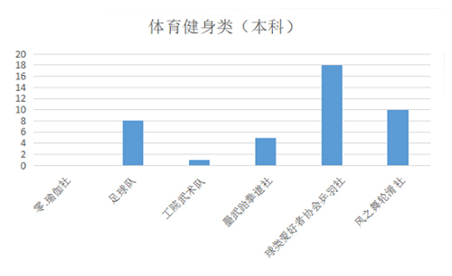 体育健身类社团本科纳新人数42人,占体育健身类社团纳新人数的21%,排名前三最受本科生欢迎的体育健身类社团是球类爱好者协会乒羽社、风之舞轮滑社、足球队。