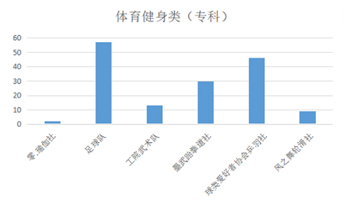 体育健身类社团专科纳新人数157人,占体育健身类社团纳新人数的79%,排名前三最受专科生欢迎的体育健身类社团是足球队、球类爱好者协会乒羽社、墨武跆拳道社。