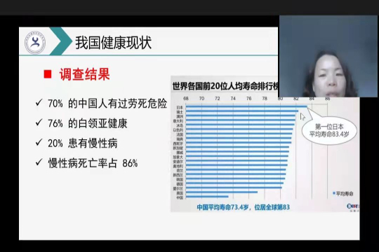 李老师主要围绕大健康背景、我国健康状况、大学生健康现状、预防疾病措施等方面展开讲述。她首先介绍了什么是大健康以及身体健康的重要性,接着通过列举“世界各国前20位人均寿命排行榜”了解了我国的健康现状,并分析出引发人们患病的主要原因之一是不健康的生活方式和环境污染。随后,李老师结合大学生健康现状以及熬夜危害等贴近学生的实际案例,并通过问卷调查与同学们频繁互动,引出对学生健康有益的建议,讲解了预防治疗疾病的措施,科普了生活用药常识,使同学们更加了解了健康的重要性以及如何预防疾病。